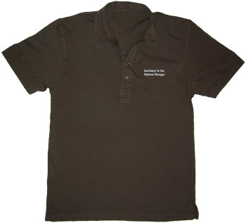 "Assistant to the Regional Manager" is embroidered in white thread on a brown 100% cotton